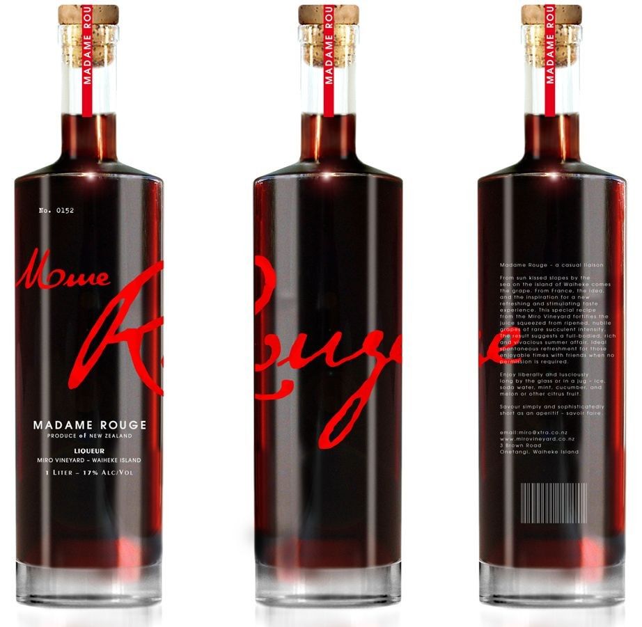 From sun kissed slopes by the sea on the island of Waiheke comes the grape. From France, the idea and the inspiration for a new refreshing and stimulating taste experience. Flavours of the summer berry fruit are captured in every bottle of Madame Rouge. This fine aperitif is made from 100% red grapes grown on Waiheke Island. The first taste will suggest a full bodied, rich and vivacious summer affair. She is heady like champagne and you should let her lead you along byways that you will never glimpse without her. She is the first truly iconic New Zealand aperitif. Because of the purity of the vinification, those who sip a glass have reported a sense of wellbeing. Madame Rouge is becoming recognized outside her current circle of friends who already know she is the most stylish aperitif. Always offer your friends a small glass as they arrive. Savoire faire.